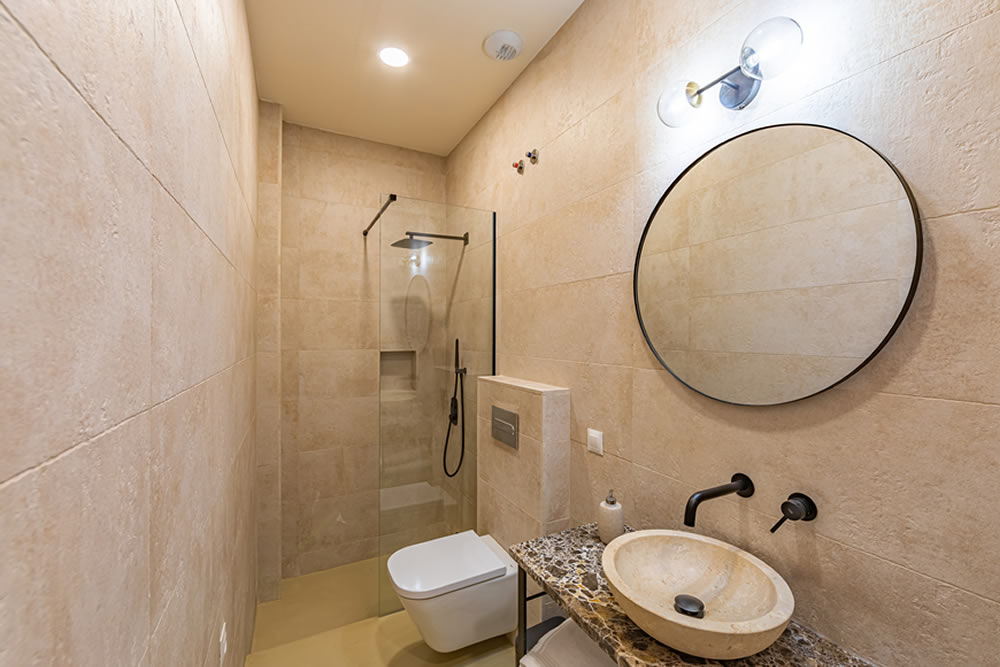 Chambre double au rez-de-chaussée qui dispose d'une salle de bain avec douche à l'italienne, lavabo et WC.