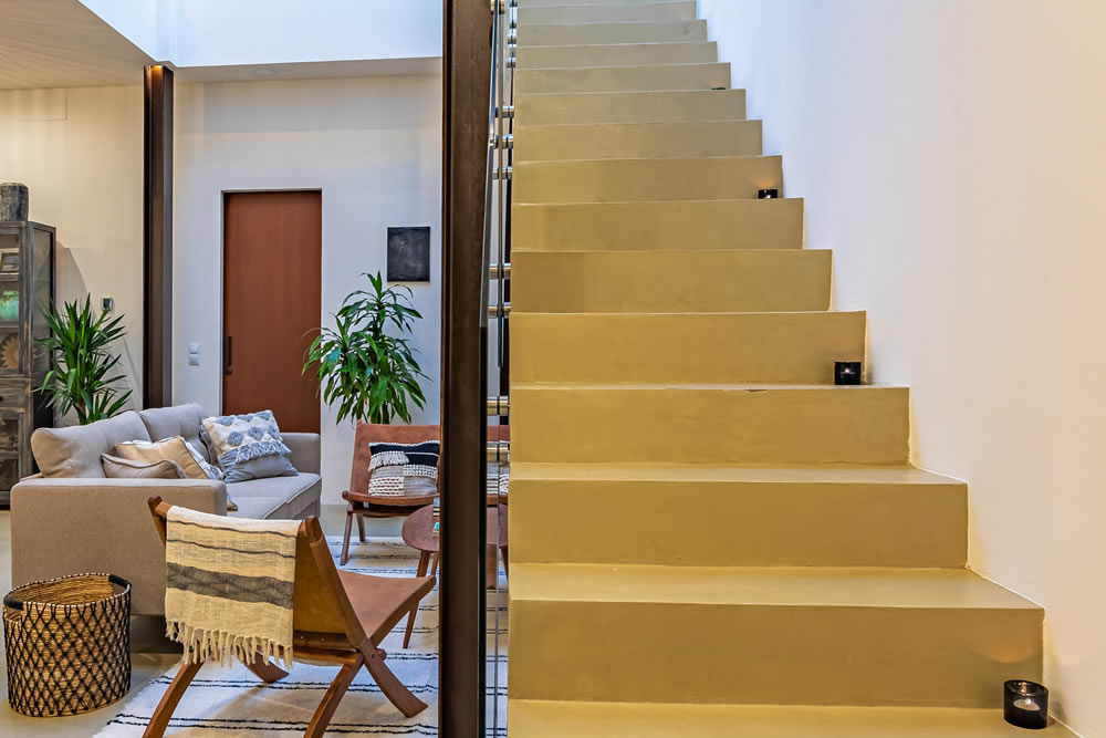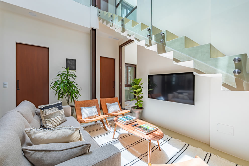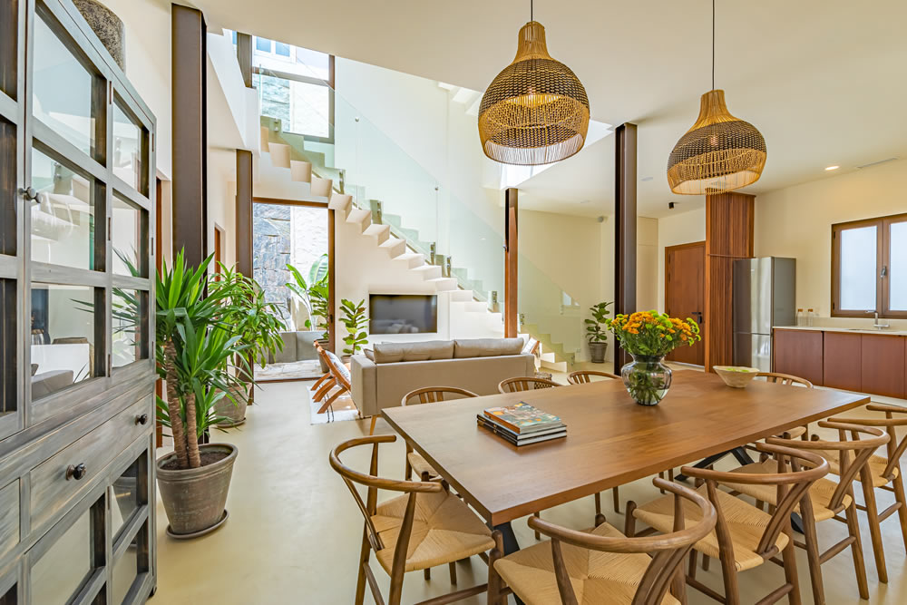 Une cuisine ouverte spacieuse, un salon et une salle à manger.